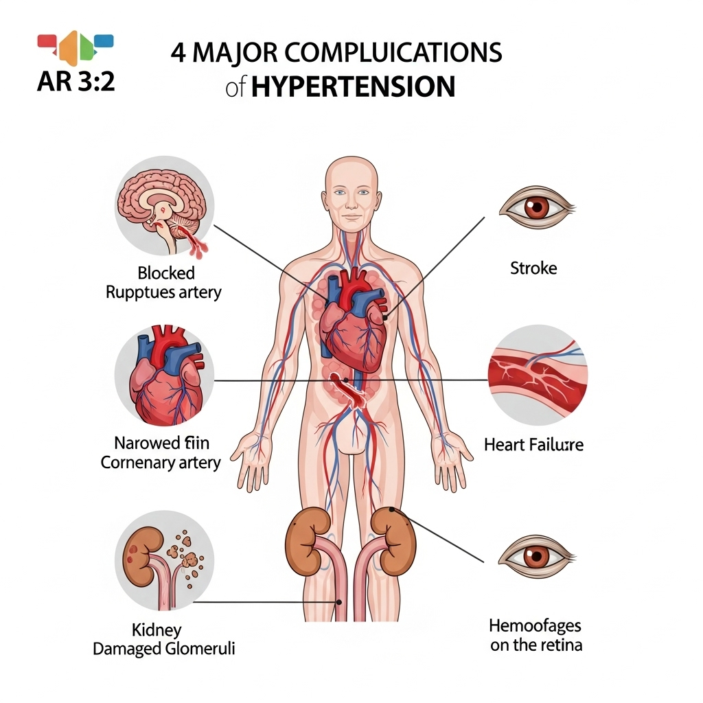 1. 심장 (심혈관질환): 강한 압력을 이겨내기 위해 심장 근육이 비정상적으로 두꺼워지고(심비대), 결국 지쳐서 펌프 기능이 떨어지는 심부전이 발생합니다. 또한 심장에 혈액을 공급하는 관상동맥이 좁아지거나 막혀 협심증, 심근경색(심장마비)을 유발합니다.