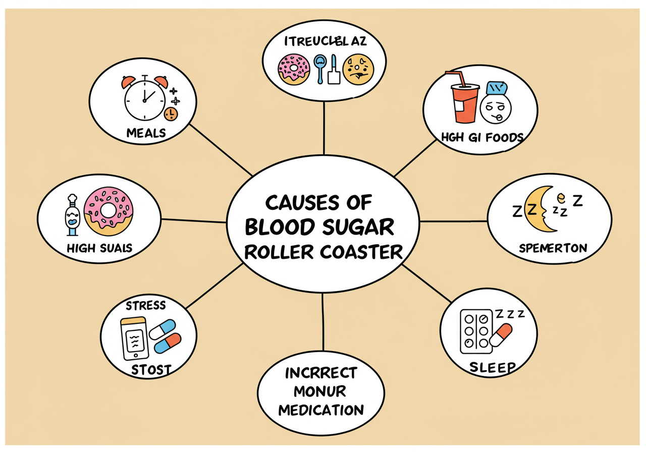 3. 잘못된 약물 용량 및 시간: 식사량에 비해 약물(특히 인슐린, 설포닐우레아 계열) 용량이 과하면 식후 저혈당을, 용량이 부족하면 고혈당을 유발합니다.