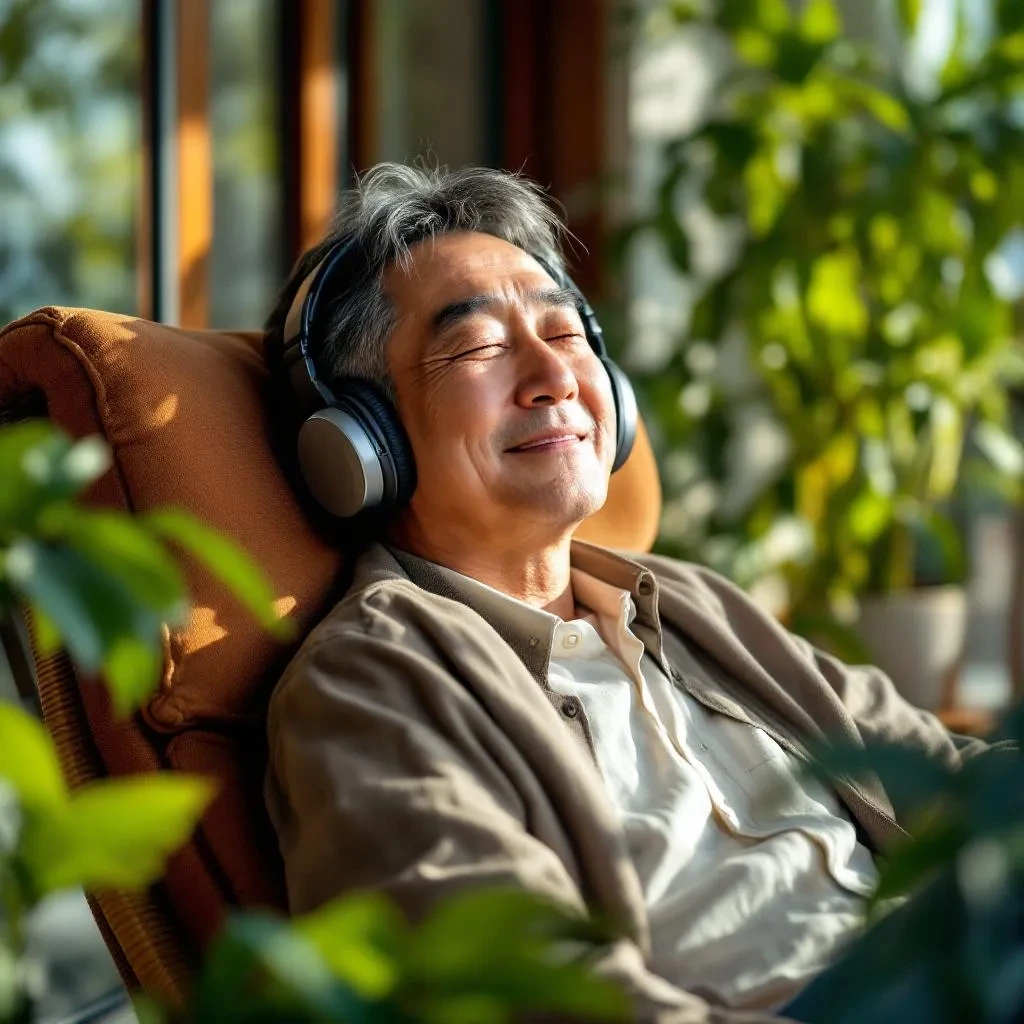 [이미지 3: 한 50대 한국인 남성이 햇살 좋은 베란다에서 헤드폰을 끼고 눈을 감은 채 편안하게 음악을 감상하고 있는 모습]