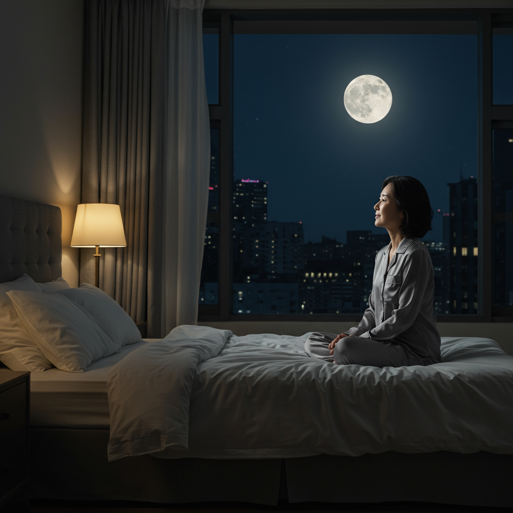 [이미지 1: 한 40대 한국인 여성이 침실에서 평온한 표정으로 창밖의 달을 보며 잠자리에 들 준비를 하는 모습]
