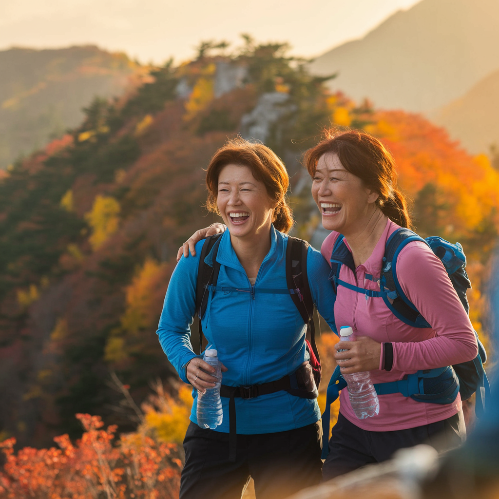 [이미지 3: 두 중년의 한국인 여성이 등산 중 정상에서 함께 웃으며 물을 마시는 모습]