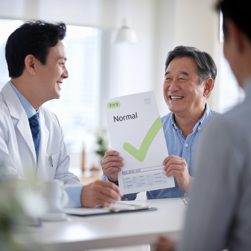[이미지 1: 한 50대 한국인 남성이 의사 앞에서 자신의 건강검진 결과지를 보며 안도와 기쁨의 미소를 짓는 모습]