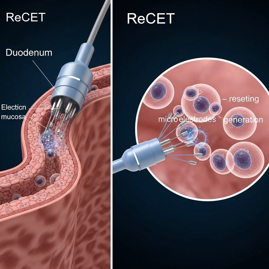 ReCET(Recellularization via Electroporation Therapy)은 십이지장 점막에 정밀한 전기 에너지를 전달하여, 인슐린 저항성을 유발하는 비정상적인 세포들을 선택적으로 제거하고 건강한 세포의 재생을 유도하는 최신 내시경 시술법입니다.