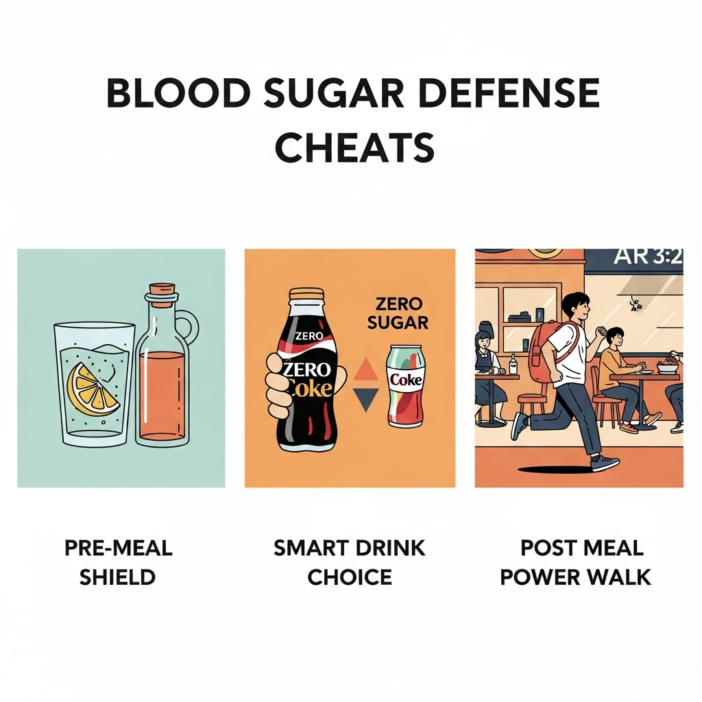 - [식전 방어] 식이섬유와 물로 방어막 치기: 자극적인 음식을 먹기 30분 전, 물을 한두 잔 마시고, 오이나 방울토마토, 양상추 샐러드 등 식이섬유를 미리 먹어두세요. 포만감을 주어 과식을 막고, 혈당 상승을 완만하게 합니다.