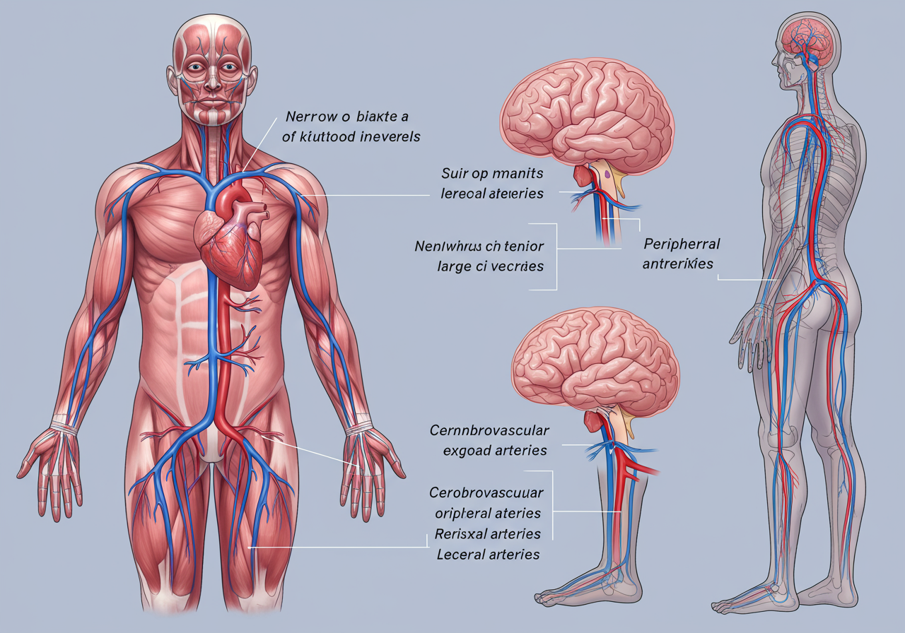 - 다리 (말초동맥): 다리로 가는 혈관이 막히면 걸을 때 통증이 생기고, 심하면 조직이 썩어 다리를 절단해야 할 수도 있습니다.