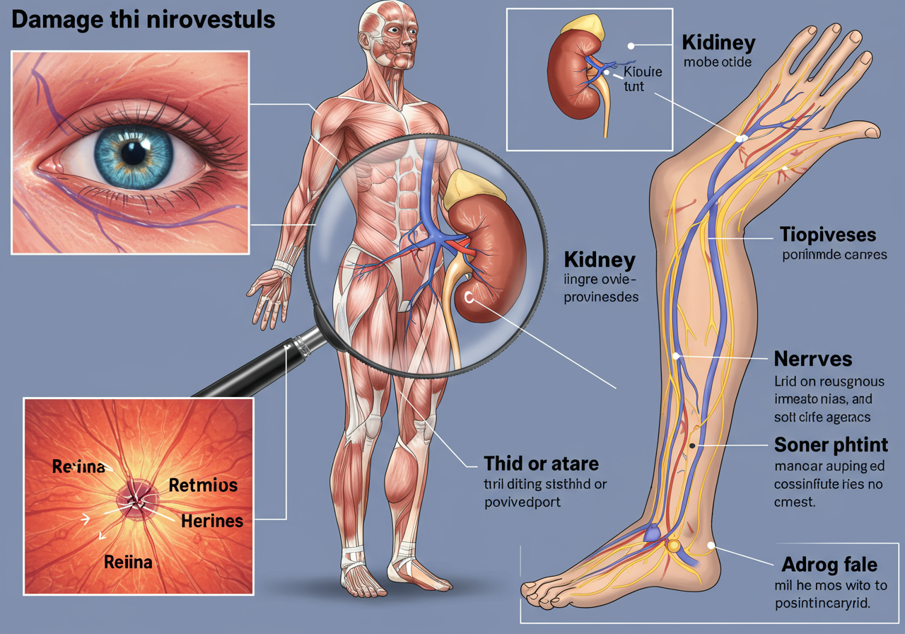 이 끈적한 피는 우리 몸 구석구석을 흐르며 혈관 내벽에 상처를 내고 염증을 일으킵니다. 시간이 지나면서 혈관은 점점 딱딱해지고 좁아지며, 결국 막히게 됩니다. 문제는 이 혈관 손상이 우리 몸의 특정 부위가 아닌, 머리부터 발끝까지 모든 곳에서 동시다발적으로 일어난다는 점입니다. 이것이 바로 '당뇨 합병증'의 시작입니다.
