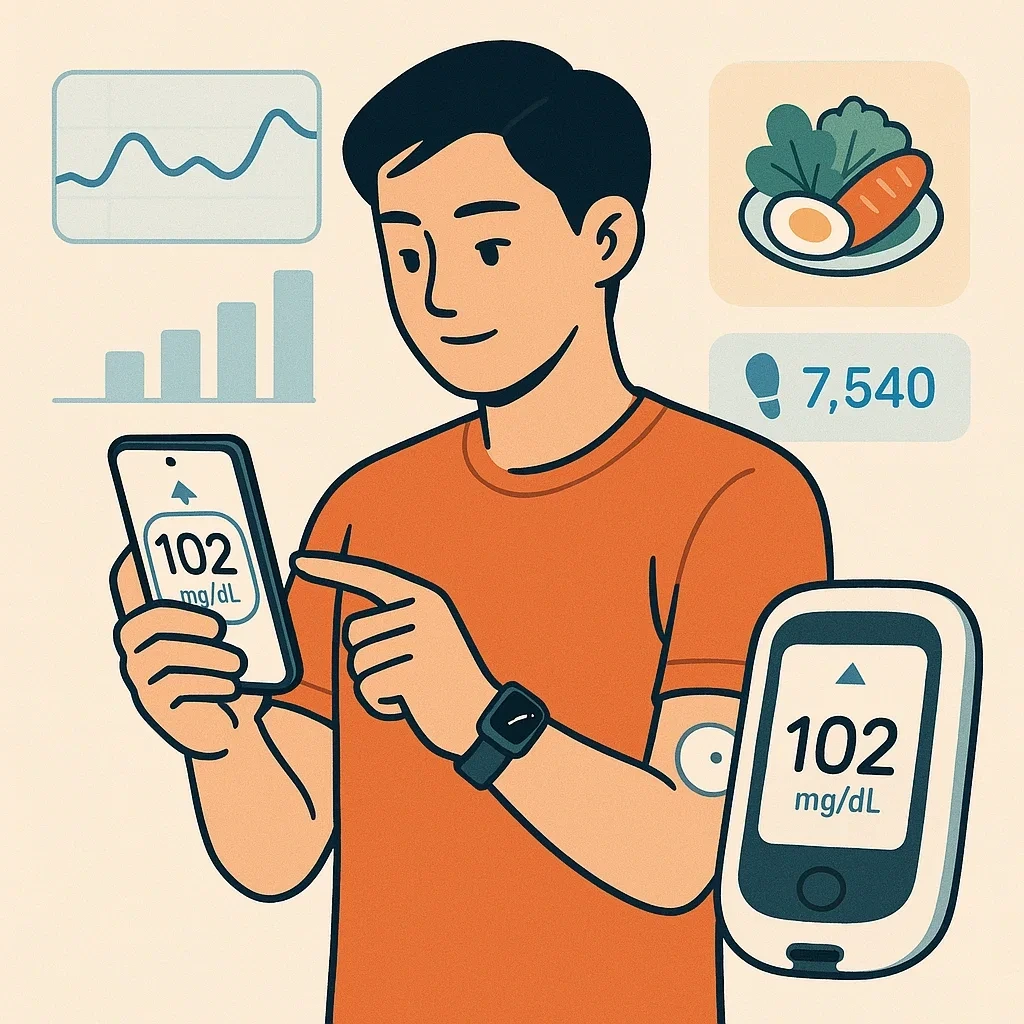 - '혈당 탐정'이 되어보세요: 어떤 음식을 먹었을 때 혈당이 급격히 오르는지, 어떤 운동이 혈당을 효과적으로 낮추는지, 스트레스나 수면이 혈당에 어떤 영향을 미치는지 직접 확인하고 기록하며 나만의 '혈당 지도'를 만들어보세요.